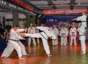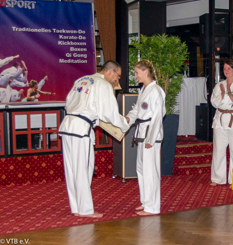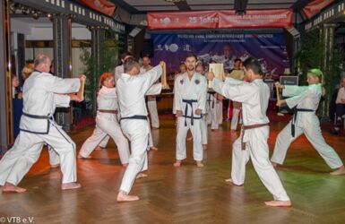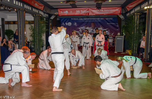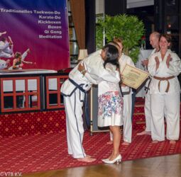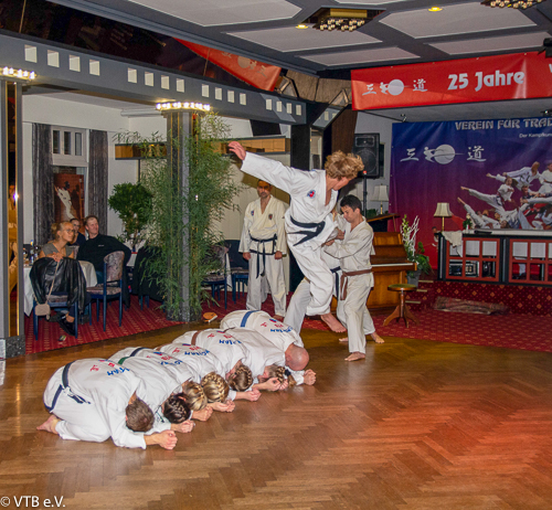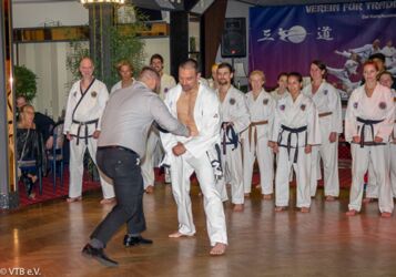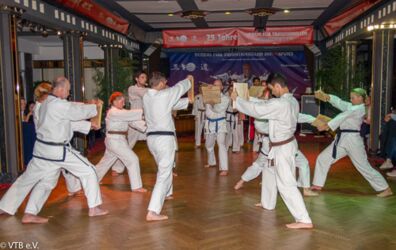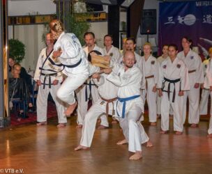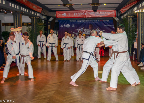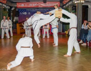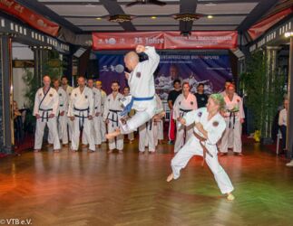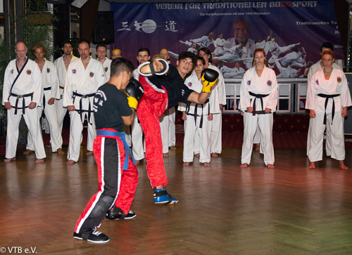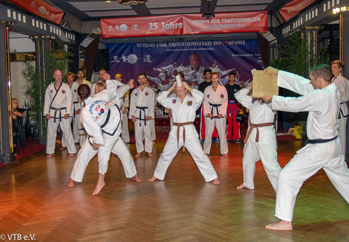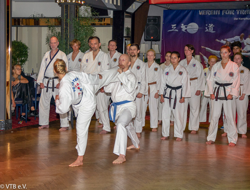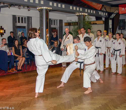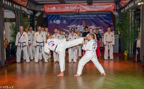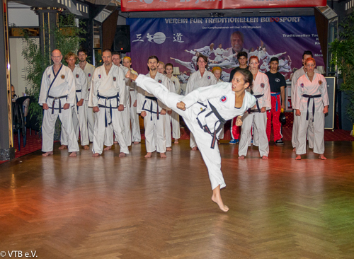Höhepunkt des Abends war die Budo-Vorführung des VTB-Demoteams, das verschiedene Aspekte aus den Bereichen der Karate-Do, Traditionellem Taekwon-Do und ein Sparring im Kickboxen zeigte. Dr. Heidi Hartmann gab eine kurze historische Einführung zur Entwicklung der Kampfkunst des Traditionellen Taekwon-Do und moderierte erklärend jeden Part der Vorführung an. Dadurch wurde der Unterschied der Kampfkunst zum Praktizieren eines Kampfsportes auch für Laien nachvollziehbar präsentiert.